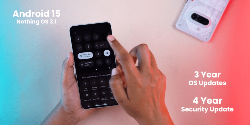 UI बिल्कुल Clean मिलता है। फालतू के ब्लॉटवेयर नहीं देखने को मिलते। इसमें Nothing OS 3.1 है। जो Android 15 पर Based है, इसमें 3 साल का Android update मिलेगा और 4 साल का Security Update मिलेगा।