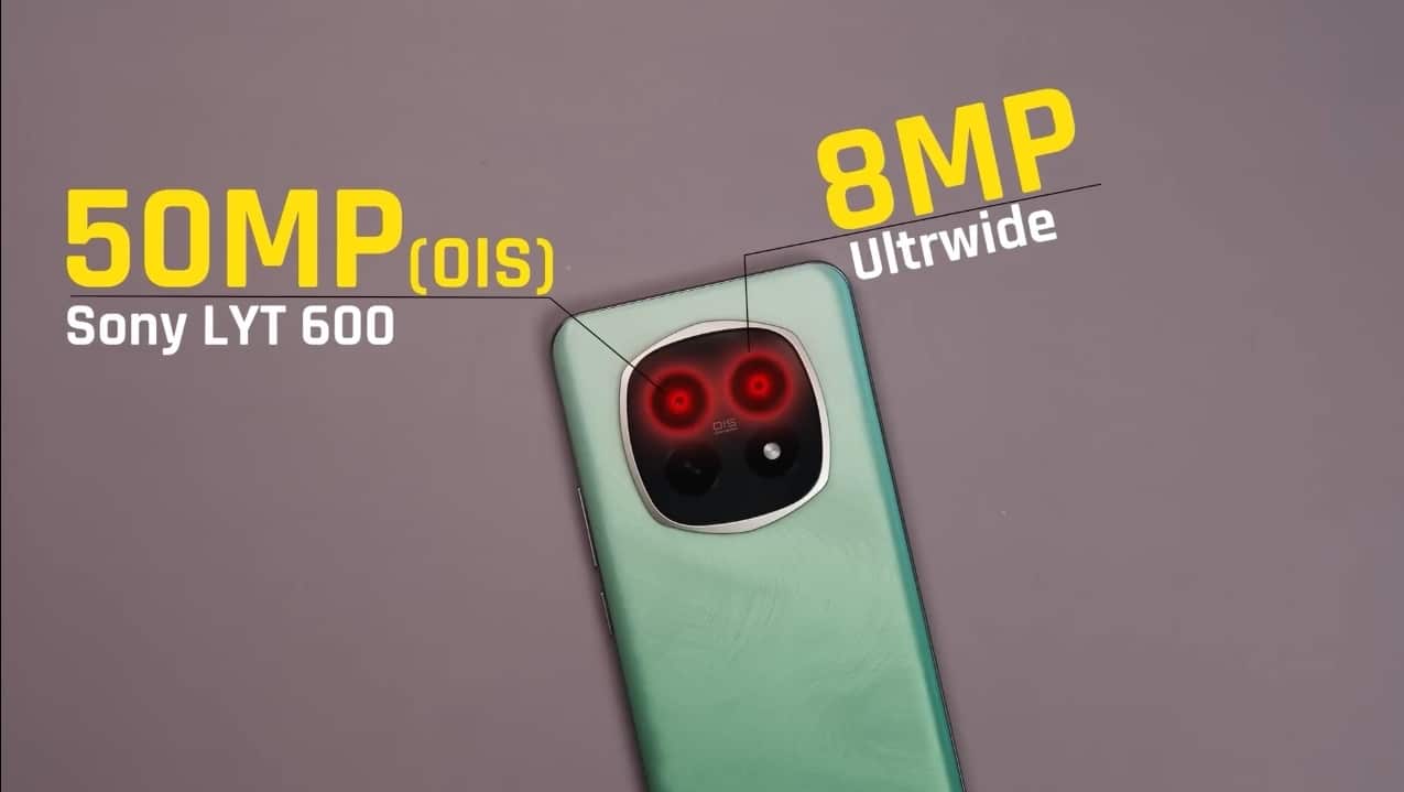 Rear में 2 कैमरे का setup मिलता है, जिसमें से Main कैमरा 50MP है with (OIS) और 8MP Ultrwide कैमरा है।