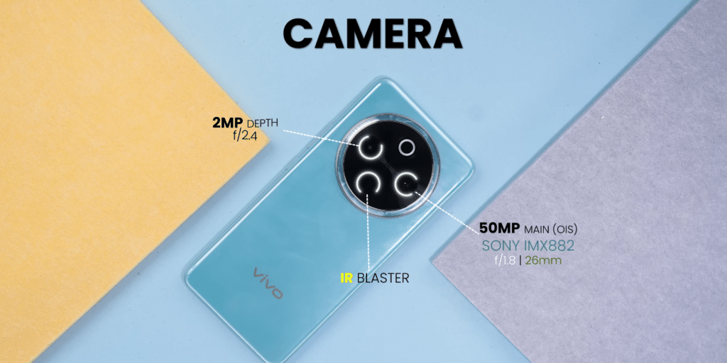 Rear में 2 कैमरा का सेटअप है। Main Camera 50 MP Sony IMX882 Camera With OIS है। 2MP Depth lens है।